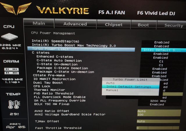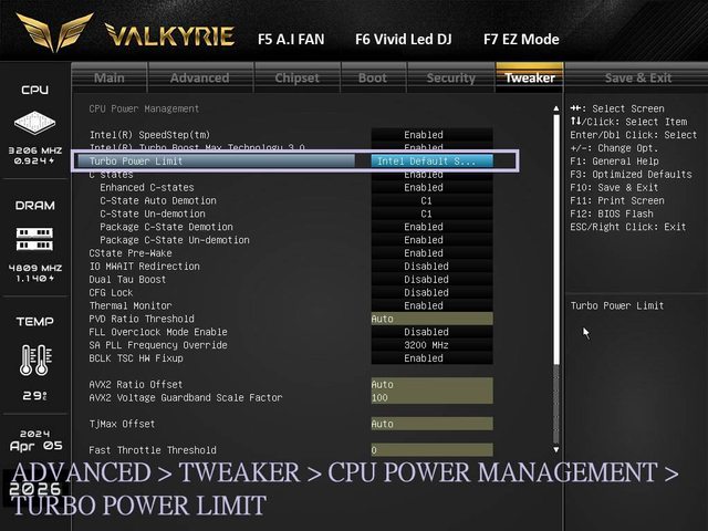 MANAGEMENT 頁面,在 TURBO POWER LIMIT 選項裡再手動開啟 INTEL DEFAULT SETTINGS