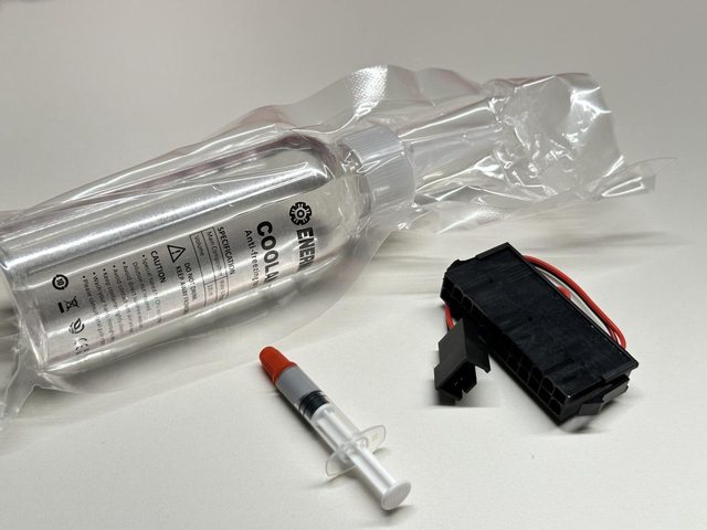 內部有100ml補充用水冷液及補充時所需的電源啟動轉接頭及一小管散熱膏。補充水冷液