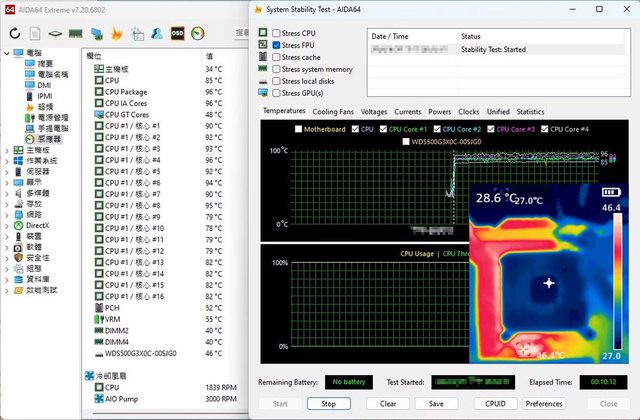 單烤FPU時電壓顯示約為1.35V,溫度則為Package 96度、P核心平均92.75度,冷排風扇轉