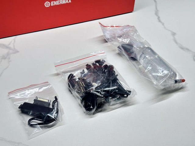 配件分為三包,皆以夾鏈袋安裝,從左至右分別是燈效控制器、裝機用扣具/線材等以及