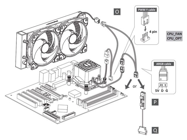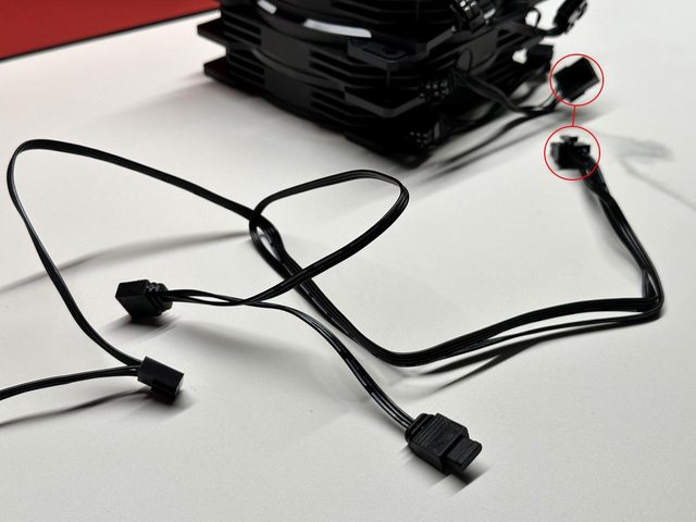 這裡借用官方圖示說明,冷排風扇4P電源及ARGB接頭皆有分接功能,能與冷頭線材串接來