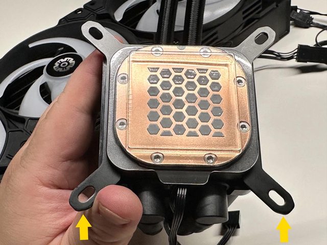 安裝前將扣具固定至冷頭,扣具安裝及拆除不需要工具,將開口朝水冷管處推到底即可。