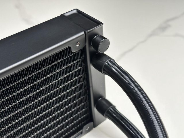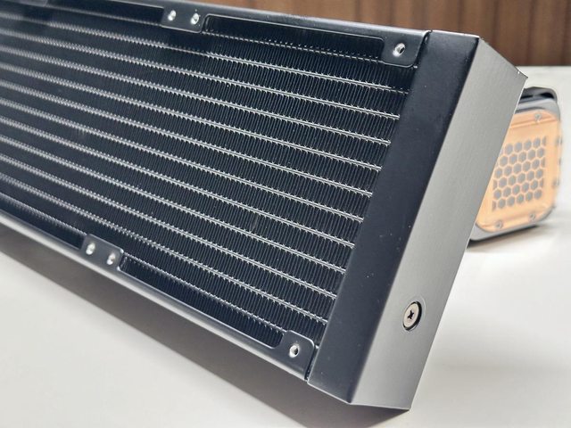 360mm款冷排尺寸為400 x 120 x 38 mm,水冷管長度標示40cm,實測約42cm,冷頭處僅有