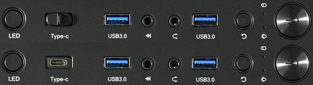 ▼頂部右前方由後(圖左)至前(圖右)分別是燈光按鈕、USB3.2 Type-C、USB3.2 Type-A、