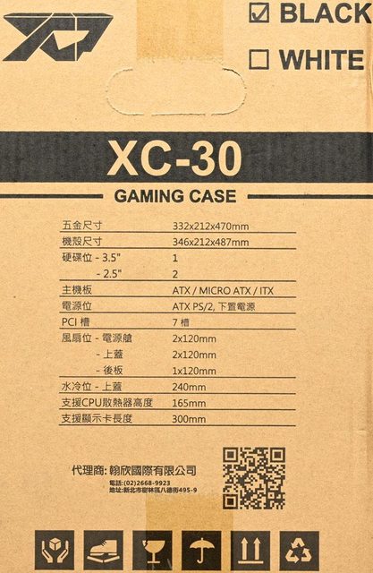▼外箱兩側有商標、顏色標示、提把開口、產品名稱、規格表、代理商名稱/聯絡方式/QR