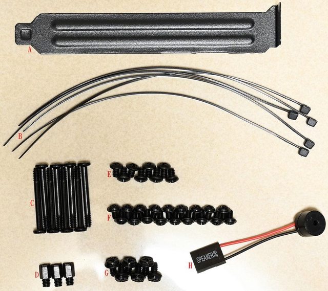 ▼隨附配件有擴充槽擋板(A)、塑膠束帶(B)、風扇固定長螺絲(C)、主機板銅柱(D)、3.5