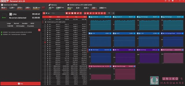 雙烤機情況下,測試過程中並未偵測到任何錯誤,同時從資訊中也可見 CPU 達 273W、顯示