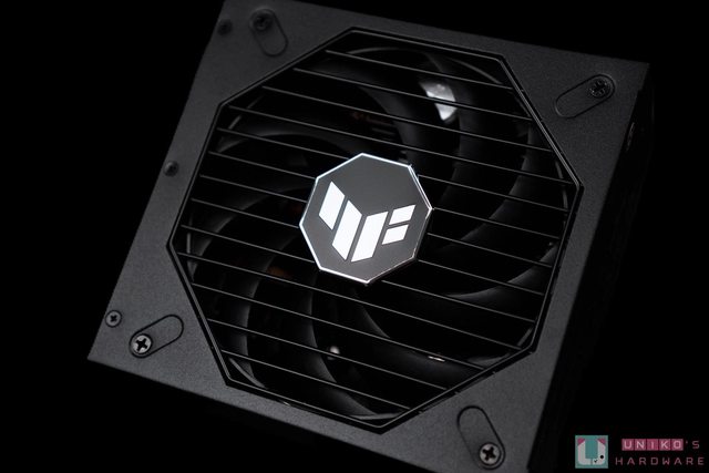 沒有 RGB 燈效,主打的是長期穩定使用。下方標示 TUF Gaming 產品系列與電源瓦數,並