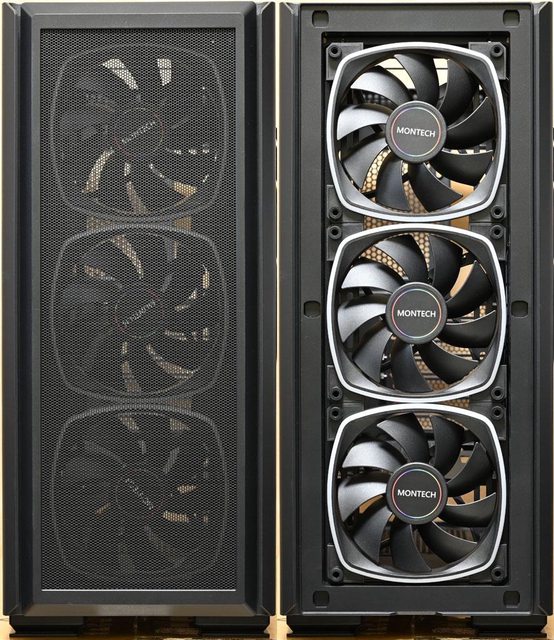 ○前方/右側前方/電源艙隔板/後方/頂部可裝最多11個120mm風扇,前方預裝3個AX140