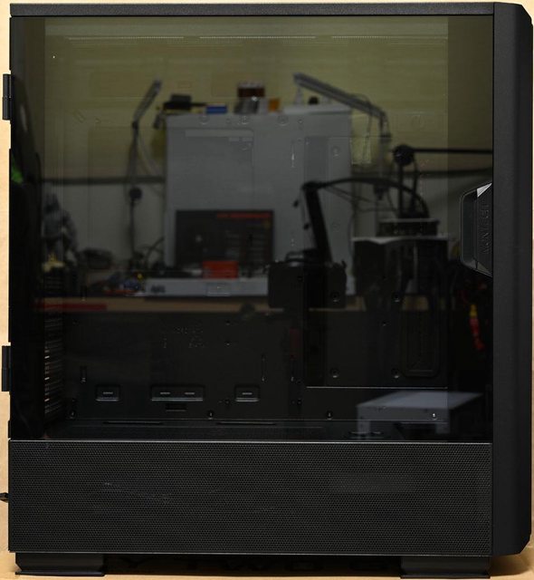 並透過磁吸方式固定。為了避免強化玻璃側板意外開啟,搬動機殼時最好額外黏貼固定