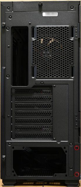 ▼後方右上通風口可裝1個120mm風扇,配置7個無支架標準擴充槽,均安裝可重複使用的