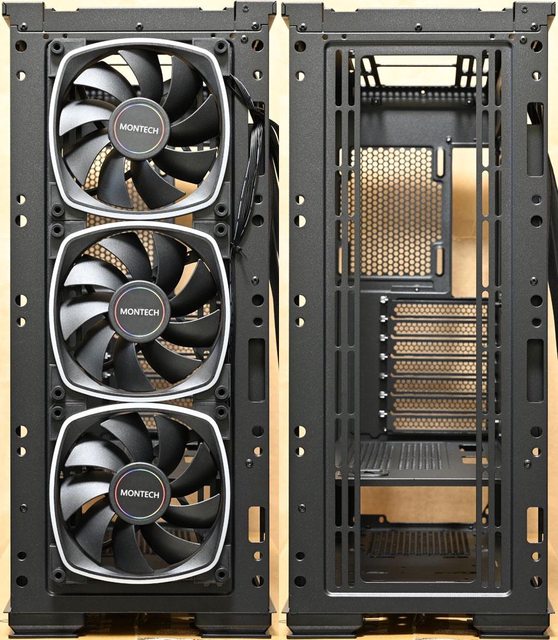 頂部中間開口兩側長條形固定孔可裝3個120mm或2個140mm風扇,水冷排可裝360mm