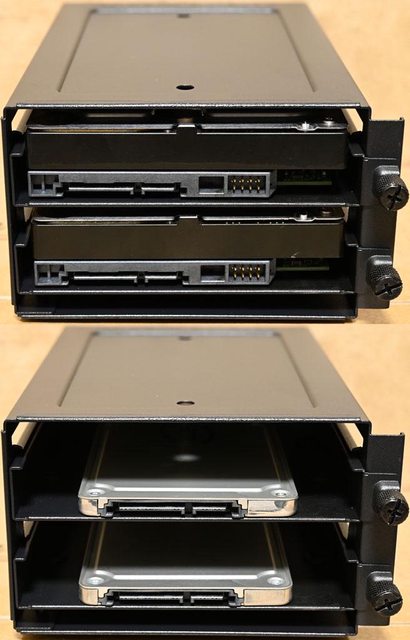 ▼底部3.5吋/2.5吋抽取式固定架安裝2個3.5吋裝置(上)或2個2.5吋裝置(下)示意圖