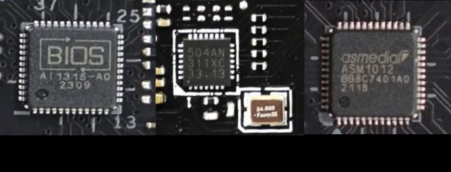 各式晶片包括供電模組和控制器、PCI-E 通道切換器和中繼器、USB HUB / PCI-E 控制器和