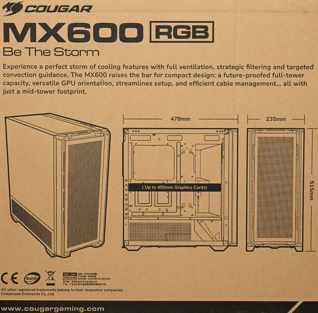 ▼此面外箱有商標、產品名稱、標語、產品簡介、外觀尺寸圖、支援顯示卡長度、認證標