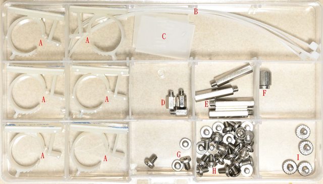▼透明配件整理盒內有塑膠束環(A)、塑膠束帶(B)、整理盒隔板(C)、主機板銅柱(D)、