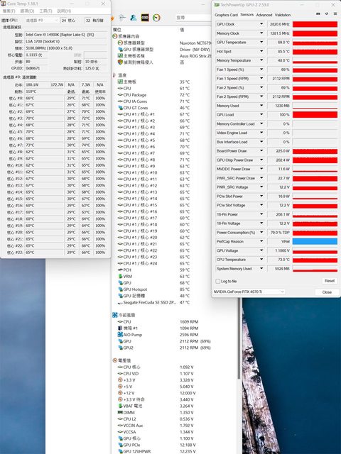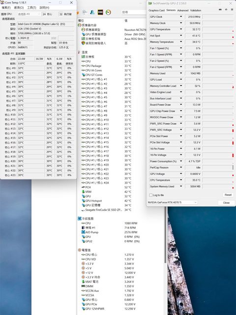▼顯示卡水平安裝的CPU+GPU高負載前Core Temp、GPU-Z感測器、AIDA64感測器頁面