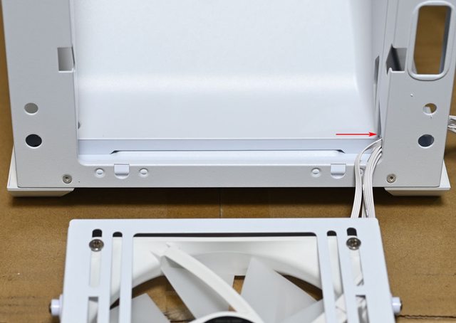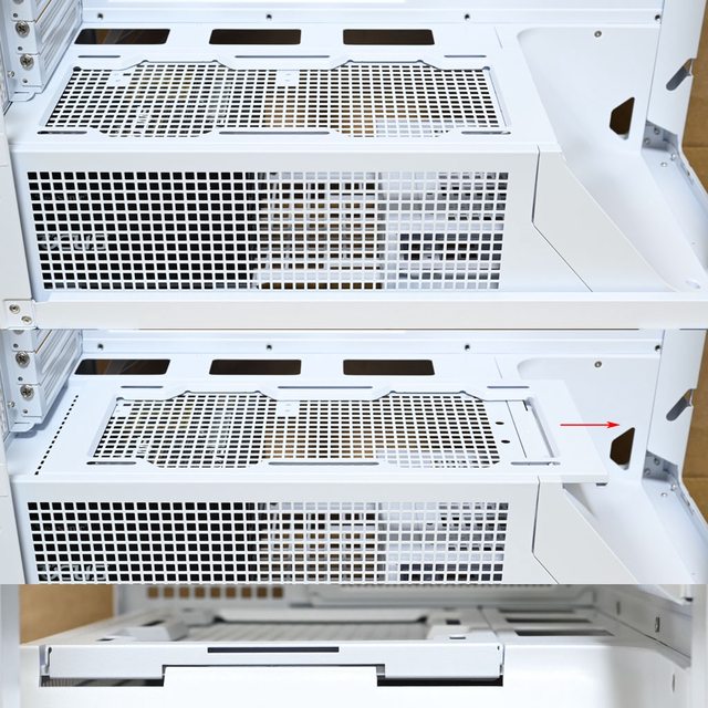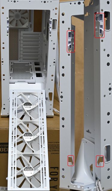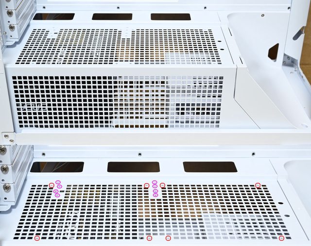 架,不用擔心會阻擋介面卡連接埠,電源艙頂部風扇/水冷排固定架具備鎖固螺絲(紅色框