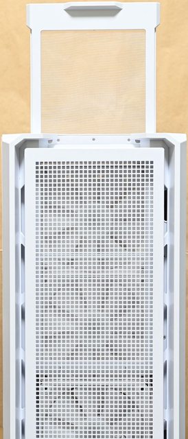 ○前方網孔板、左/右側板、左側下方網孔板都採用免螺絲快拆設計,前方配置上抽式過