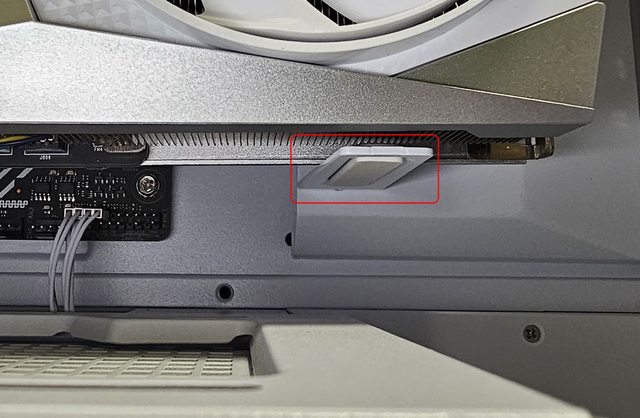 ▼即使移動顯示卡支撐架前後位置,仍會覆蓋在顯示卡其中1個風扇上方,雖然沒碰到扇