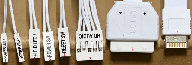 ▼白色機殼連接線組,1為電源指示燈接頭,2為硬碟指示燈接頭,3為電源開關接頭,4為