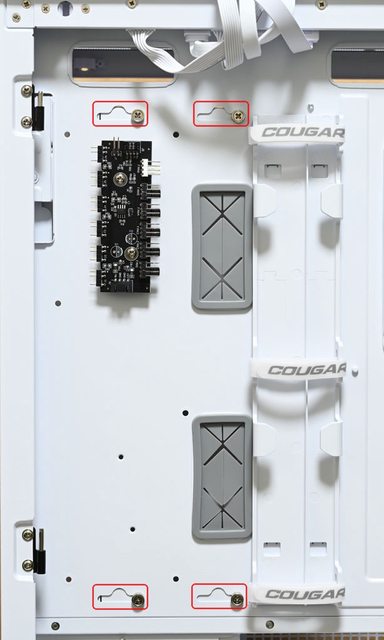 ▼右側前方遮線蓋板穿線開口位於右上及右下處(紅色框),要從這兩個位置走線才能完全