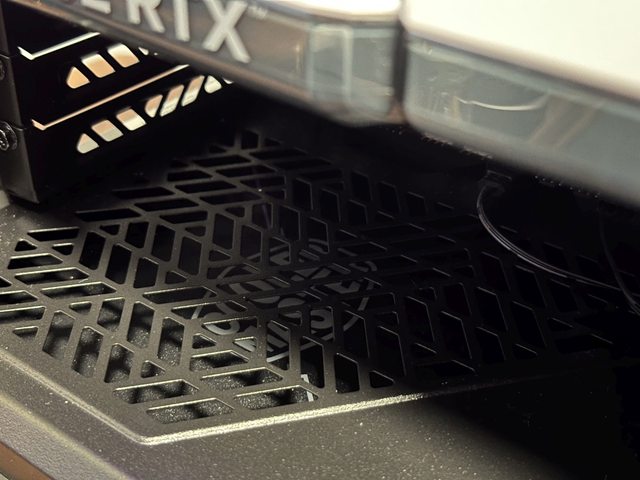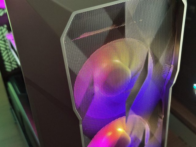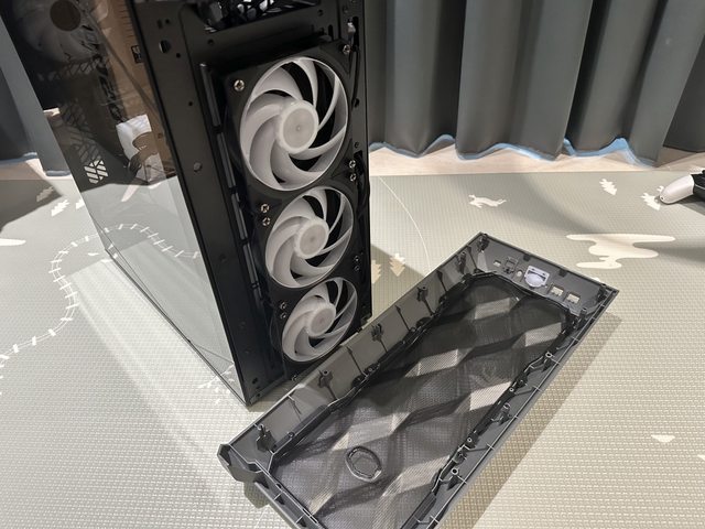 正面為細緻的Mesh網孔,未搭配防塵網僅以細小孔洞防塵,可安裝3顆12cm風扇,出廠時
