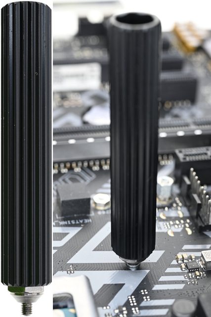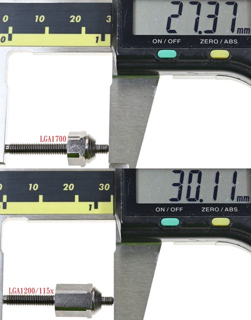 ▼LGA1700螺柱(上)六角部分較短,總長度27.4mm,LGA1200/115x螺柱(下)六角部分較長