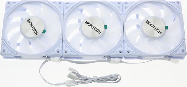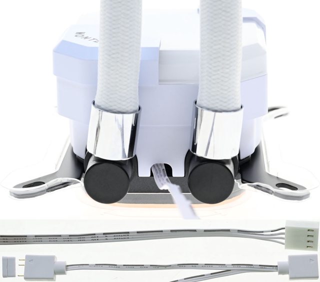 一端有MONTECH字樣,預裝3個120mm發光風扇,水管包覆編織網,直徑12.5mm,編織網部