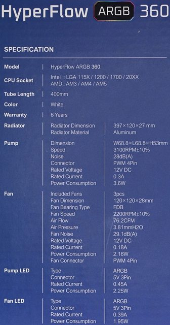 覆編織網,隨附管路固定扣,厚度27mm鋁製360mm水冷散熱排搭配3個FDB軸承120mm發光風