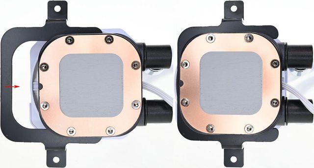 ▼安裝AMD托架時,將托架開口從進/出水管對面位置依紅色箭頭方向插入水冷頭底部兩側