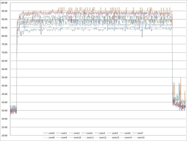 ▼功耗限制280W下高負載30分鐘CORE TEMP溫度記錄圖