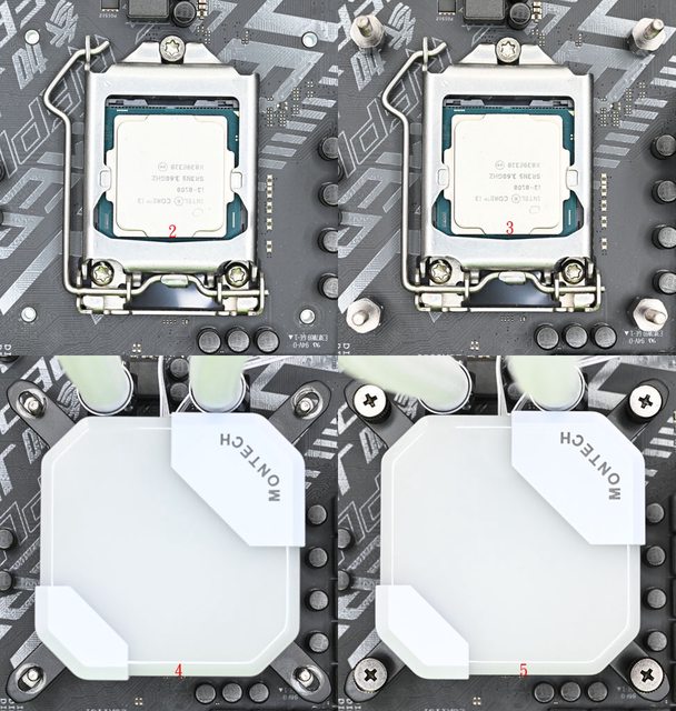 散熱片發生干涉,確認完成後取下水冷頭底部保護蓋,將Intel托架孔洞對準螺柱套入(4)