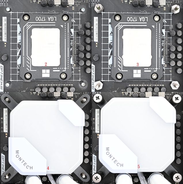 LGA1200/115x螺柱螺牙較短的一端鎖入鎖點(3),正式安裝前先確認水冷頭水管接頭不會