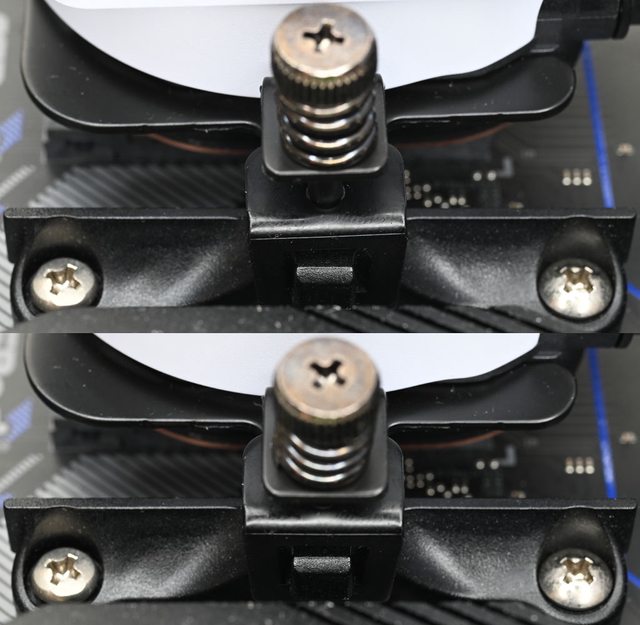 下水冷頭底部保護蓋,將兩端扣耳扣入主機板原裝散熱器托架卡榫(上圖),兩端扣耳扣入