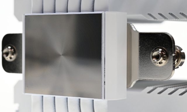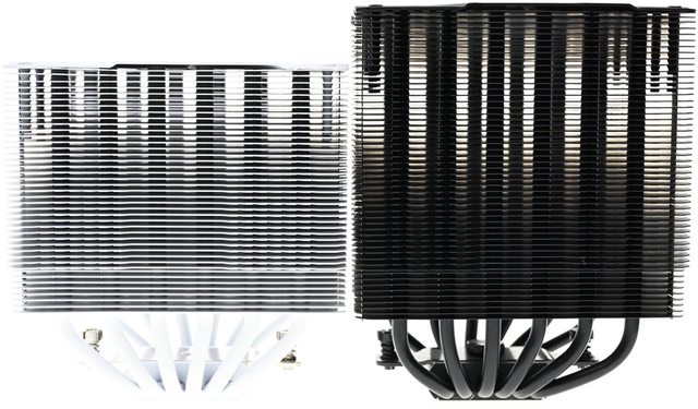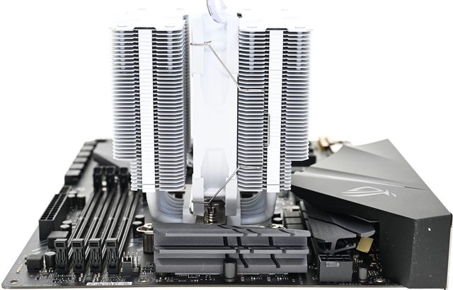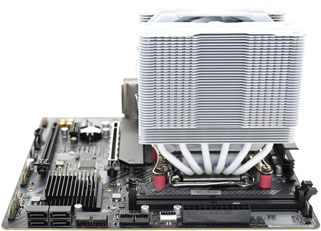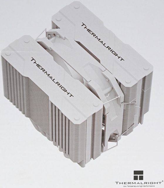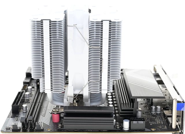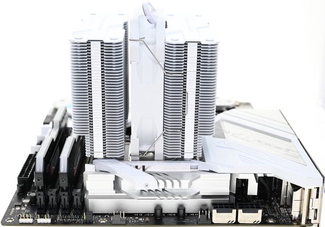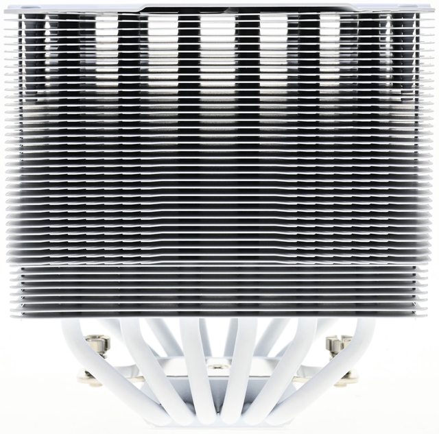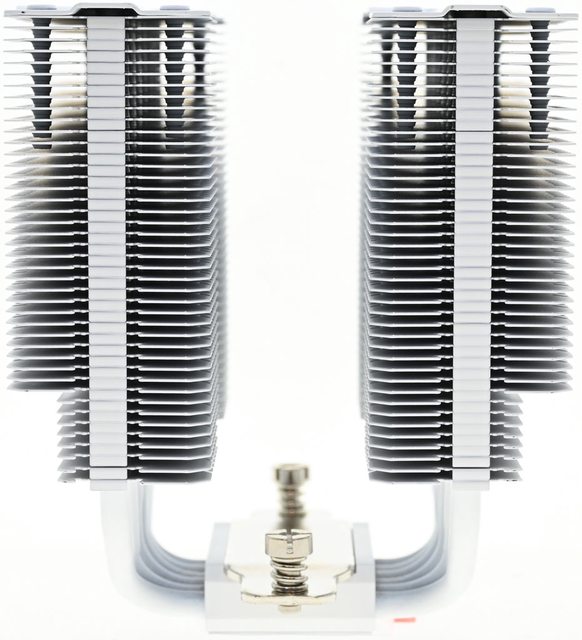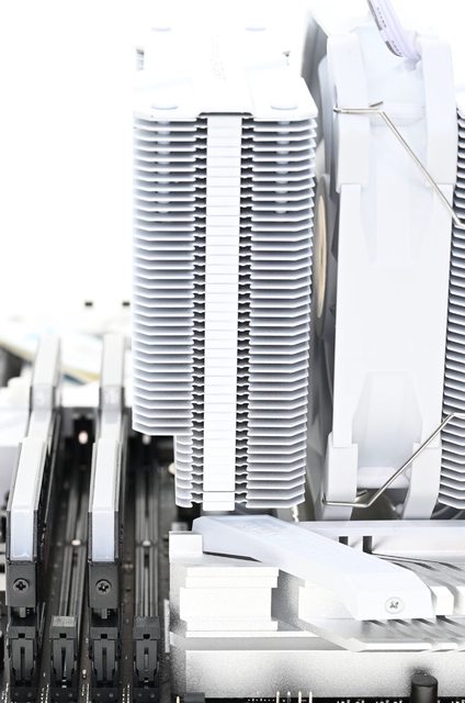 42層高密度鰭片,最下方8片鰭片裁切以閃避記憶體,熱導管與鰭片均採全白處理,頂部