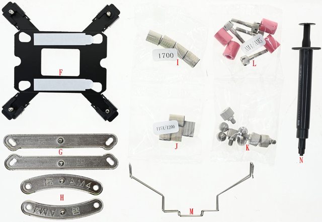 固定柱/Intel托架固定螺絲(K)、紅色AMD套管/AMD托架固定螺絲(L)、風扇固定線扣(M)、
