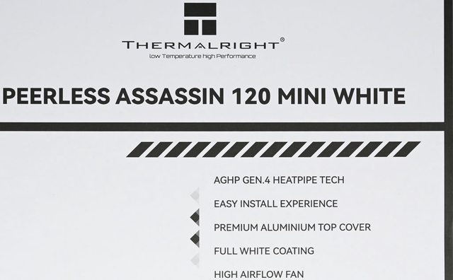 ▼此面外盒有PEERLESS ASSASSIN 120 MINI WHITE產品名稱、135mm Height圖示、AGHP