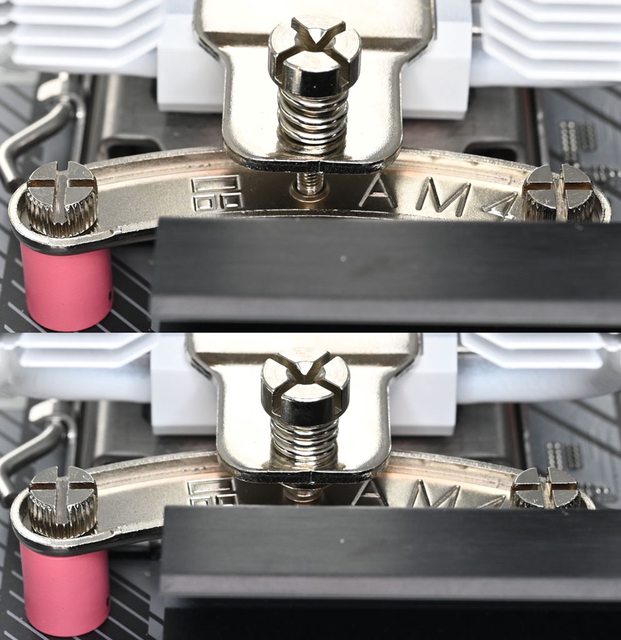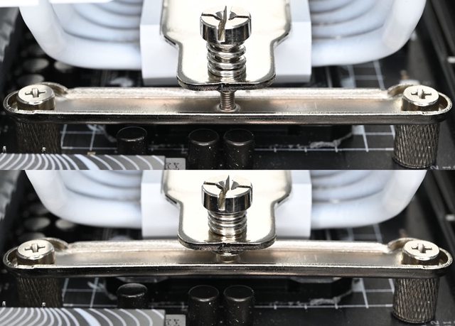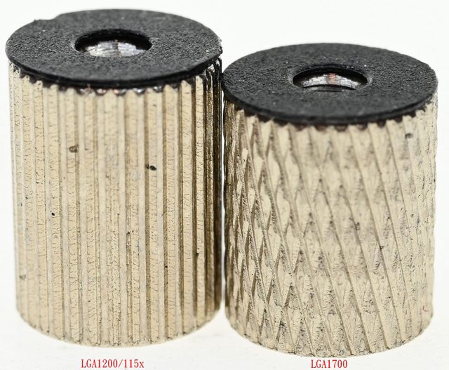 ▼LGA1200/115x托架固定柱外觀為直條紋溝槽(左),LGA1700托架固定柱外觀為斜線壓花(