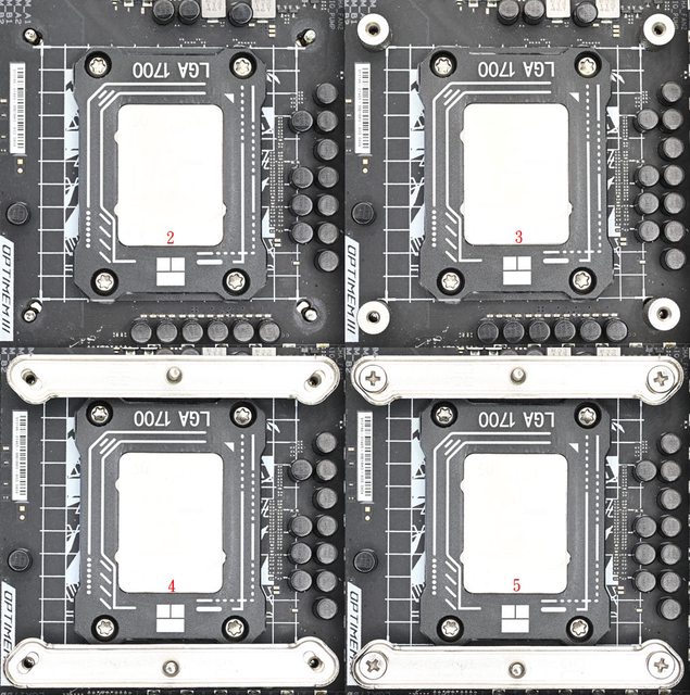 LGA1700托架固定柱有黑色墊片那面朝下鎖入固定螺牙(3),4個固定柱完全鎖入固定螺牙