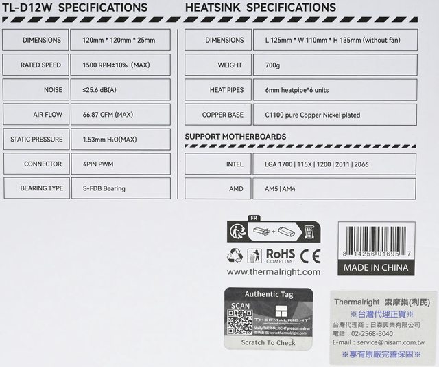有白色裝飾蓋,配置S-FDB軸承TL-D12W白色風扇。隨附TF7高品質散熱膏,出示保固卡及