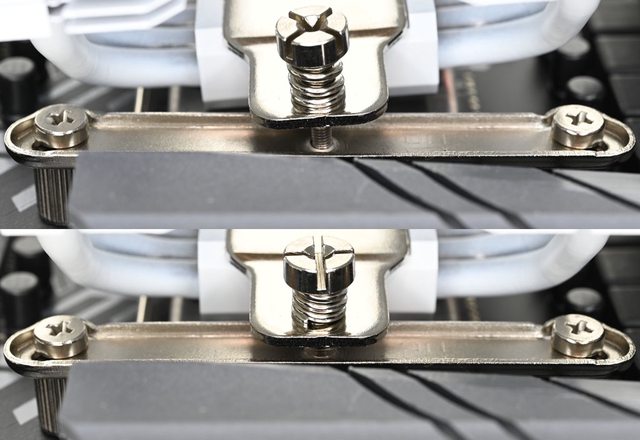 頭螺絲固定在散熱器底座頂部,壓板兩邊設置彈簧螺帽,用來鎖在托架上並提供接觸下壓