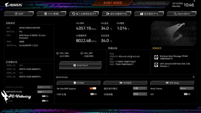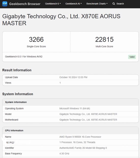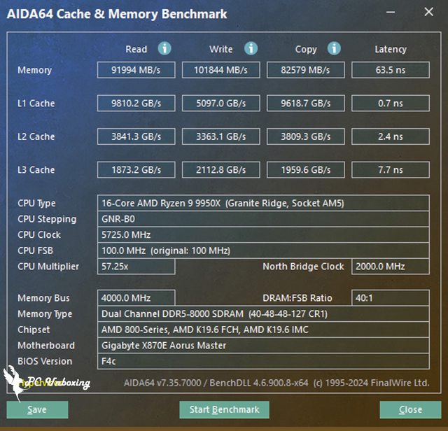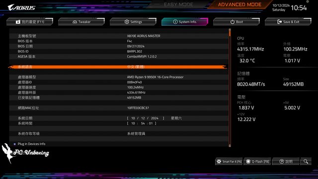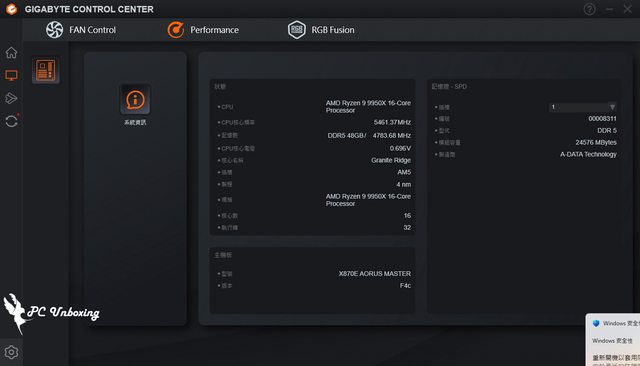 ↑X870E AORUS MASTER 搭配 AMD Ryzen 9 9950X 處理器進行測試。