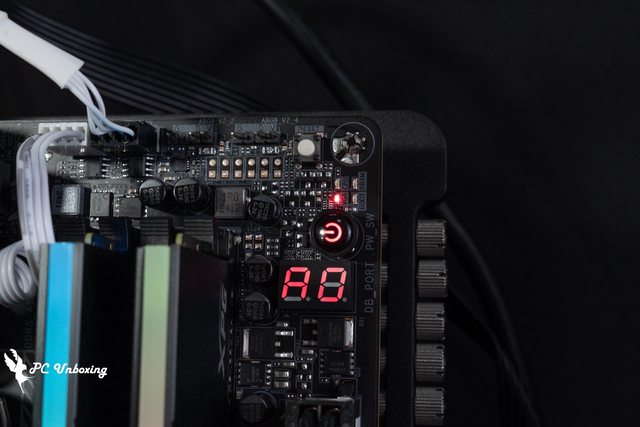 ↑EZ DeBug 燈號、PW_SW 快速開機按鍵、除錯燈號代碼顯示、主機板 24-Pin 供電插槽、