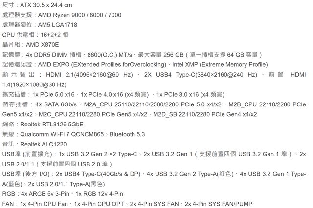 9900X 等 Granite Ridge 處理器之外,也搭載了 USB4 Type-C、Wi-Fi 7、前置 HDMI 輸