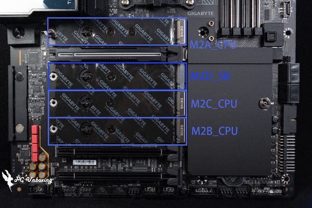 筆者較為驚喜的部分,雖說 M2B_CPU 及 M2C_CPU 是跟顯示卡插槽共用頻寬,部分玩家可