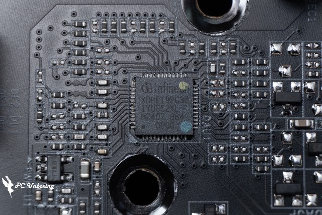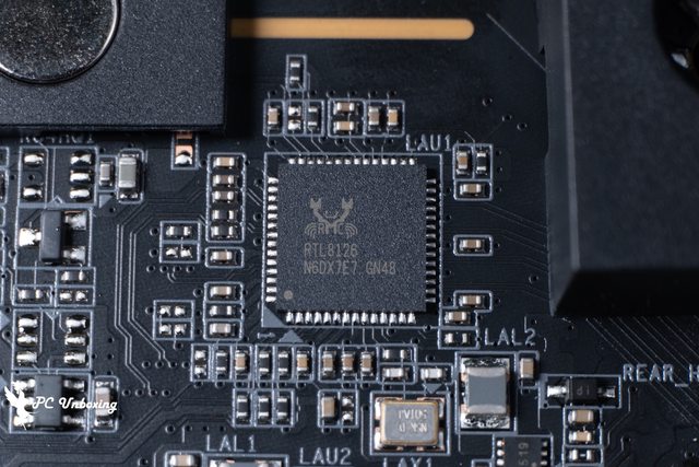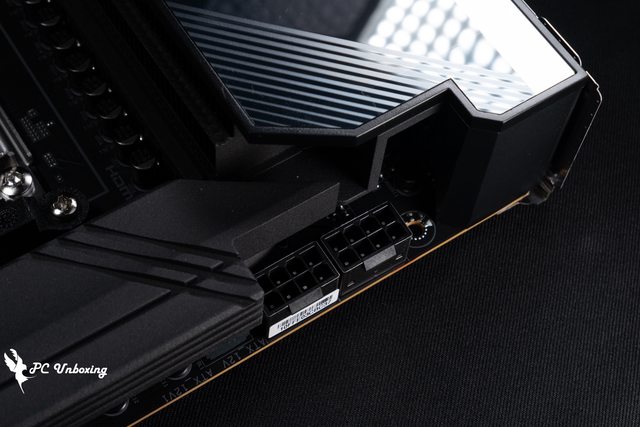 ↑主機板供電區塊部有 VRM Thermal Armor Advanced,內藏熱導管和 12 W/mK 導熱墊。