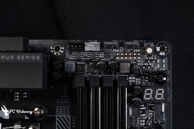 主機板右上角則有兩個 4-Pin 風扇供電插槽,分別為 CPU_OPT、CPU_FAN 水冷與風扇供