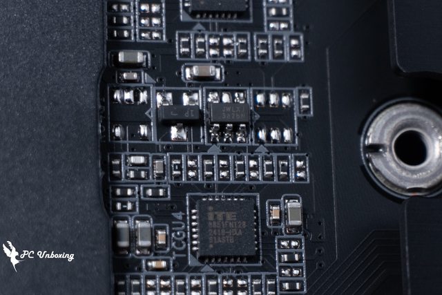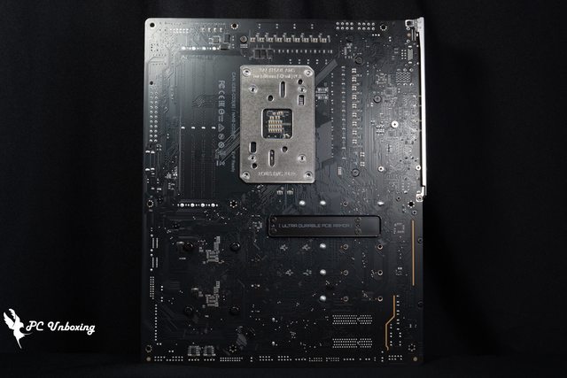 ↑主機板背面展示,沒有強化背板相當可惜,Ultra Durable PCIe Armor 為 PCIE x16 金