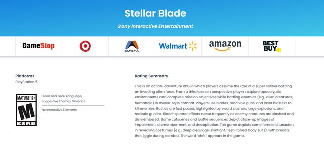 https://www.esrb.org/ratings/39752/stellar-blade/ https://pbs.twimg.com/media/GGdsdXmWwAA5S1D.jpg